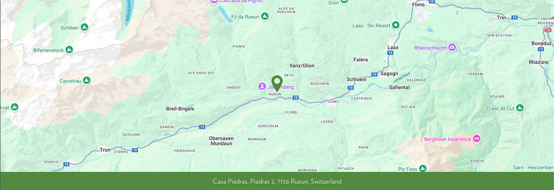 Die Ferienwohnung liegt mitten im Dorf Rueun, Kanton Graubünden, 150 km von Zürich, 35 km von Chur und 15 km von Flims und Laax entfernt. Ganz in der Nähe liegen die Skigebiete Brigels/Waltensburg, Obersaxen, Flims und Laax. Einkaufsmöglichkeiten: In Ilanz (5 km) finden Sie Migros, Coop, Aldi, Lidl, Müller, Denner. Für Shopping bieten sich in Flims und Chur zahlreiche Möglichkeiten. Das Haus steht direkt hinter der Kirche. Einzelne Gäste fühlt sich durch den Glockenschlag nachts gestört.